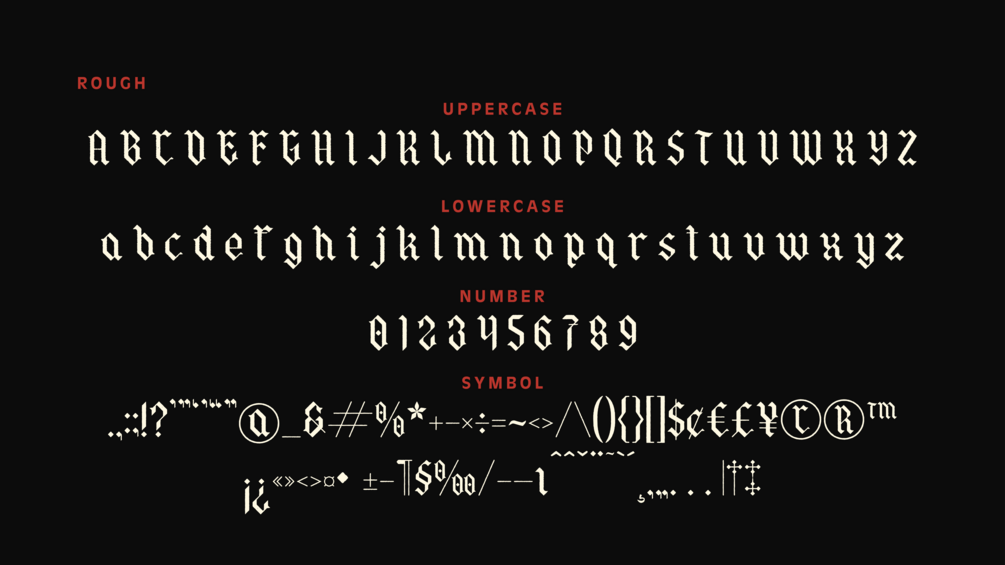 The Qordhion Modern Blackletter font is a contemporary interpretation of traditional blackletter or gothic styles. It blends historical elements with modern design sensibilities, resulting in a typeface that retains the distinctive sharp angles and intricate details characteristic of blackletter fonts, while also incorporating smoother curves and simplified forms typical of modern typography.