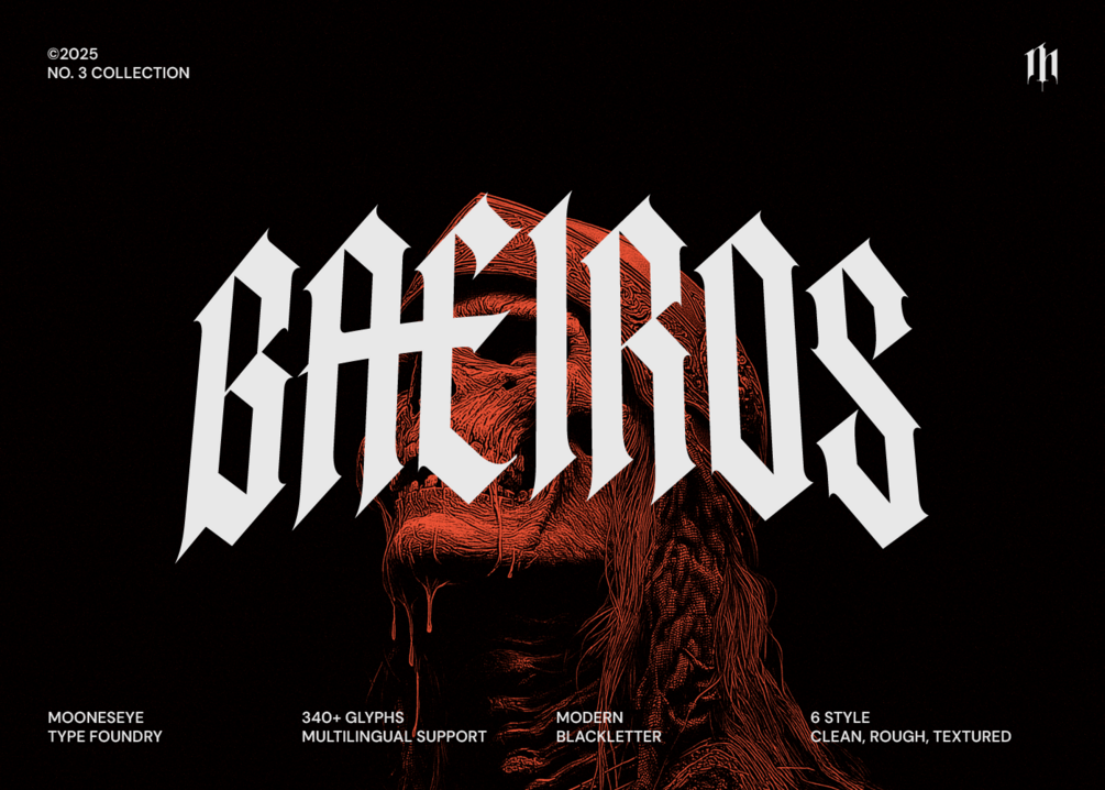Baeiros is a powerful modern blackletter font designed to make an unforgettable statement. It takes the classic, gothic style and gives it a clean, geometric update, making it perfect for today’s boldest designs.